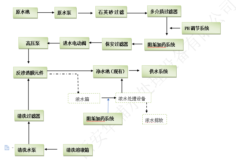 1.項(xiàng)目采用一級+二級反滲透、EDI、超濾等膜處理工藝處理。