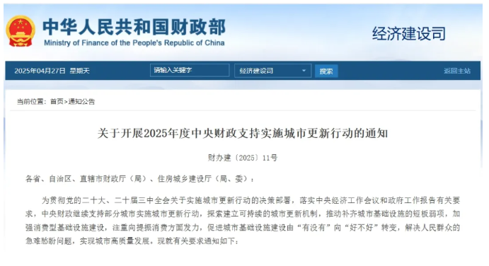 近日,財(cái)政部、住房城鄉(xiāng)建設(shè)部發(fā)布《關(guān)于開(kāi)展2025年度中央財(cái)政支持實(shí)施城市更新行動(dòng)的通知》。
