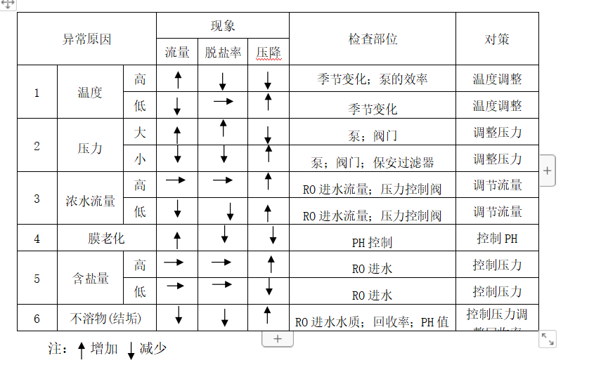 (1)裝置運行時如出現以下任一情況,則必須立即進行化學清洗。(在標準條件下,即壓力1.5MPa, 水溫25℃, 回收率75%)